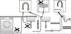1. Размещайте технику недалеко от мойки. Точка подключения воды и сливная трубка должны находиться на расстоянии не более 1,5 м. Это избавит от перегруза насоса (из-за удлинения шланга) и уменьшит вероятность протечек воды и отработанных после мойки стоков.